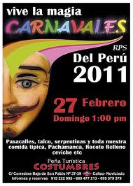 Quién no ha sido partícipe de la alegría que se vive en los carnavales con los coloridos pasacalles, vistosas yunsas o cortamontes, cantos y danzas que hacen participar a grandes y pequeños. Y es que a diferencia de la capital peruana, muchos de los pueblos del interior del país celebran con júbilo y majestuosidad una fiesta costumbrista producto del contacto de dos culturas distintas la occidental y la indígena. Una sugestiva mezcla de lo místico y lo profano.Y es que los carnavales se celebran en el campo y en la ciudad. Se inicia una semana antes del miércoles de ceniza (según el calendario religioso) y en gran parte del país conserva una similar estructura festiva. Su celebración conlleva toda una planificada coordinación, poniendo en marcha un sistema de reciprocidad y de compañerismo como la conformación de comparsas de danzas interpretada por los barrios e instituciones locales a fin de competir y hacer alarde de sus mejores bailes y cantos, sin olvidar claro está de las vestimentas y disfraces para el evento. Los mayordomos o alferados de la fiesta además de coordinar las comparsas, se hacen cargo de la alimentación para estos días. Exquisitos potajes festivos: como el sancochado o puchero muy difundido en Cajamarca, la patasca, papas y choclos de la primera cosecha del año, preparados en grandes ollas. Las chichas de maní y de jora infaltables para amenizar la fiesta. También se comparte las frutas.